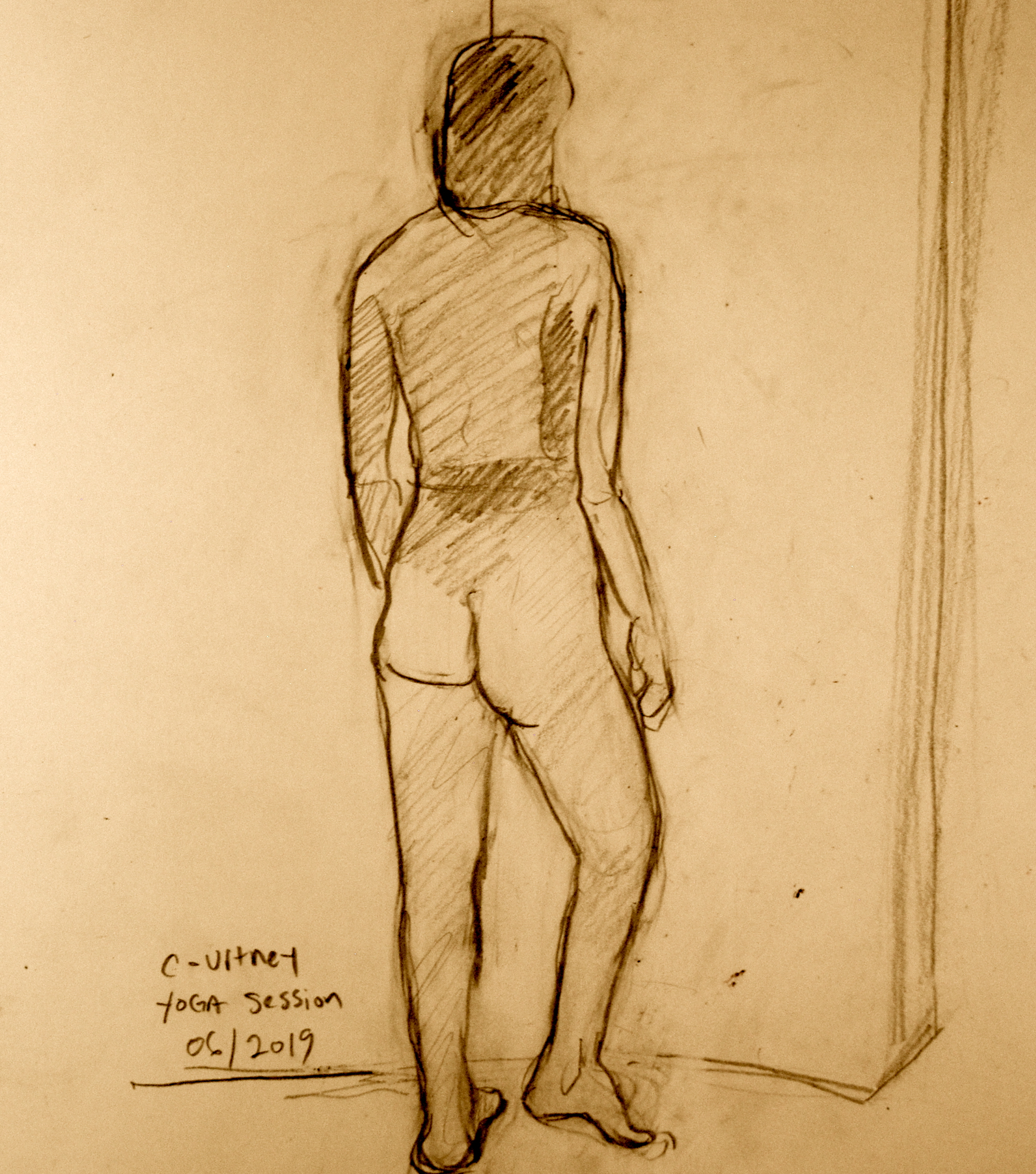 Standing Nude in Studio: Posterior, graphite on toned paper, 10 minutes, 24″ X 24″ , 2019, private collection