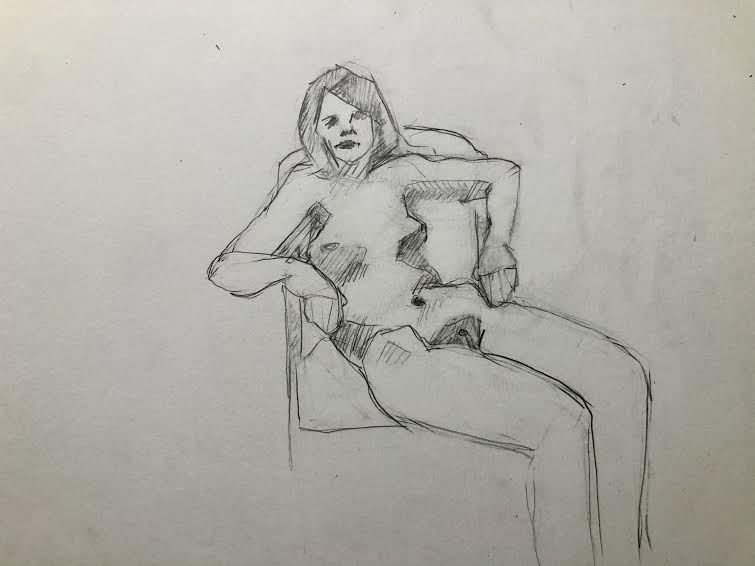 Nudes with Legs Draped Over Chair Arm, 60 mins, graphite and charcoal on arches paper, 36″ x 24″ 2017, $200