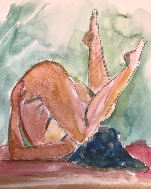 Laying Nude with Legs Raised on Green Blanket , watercolour, 24″ x 36″, 2020, $200