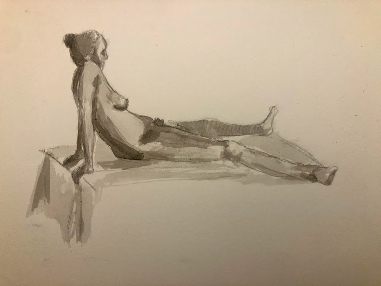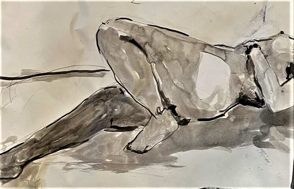 Seated Nude with Out-stretched Legs, Pencil and ink wash on paper, 15″x11″, 2020, $125
