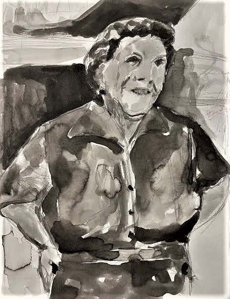 A Cockney Queen, ink and pencil on paper, 18″ X 24″, 2022, private collection of artist